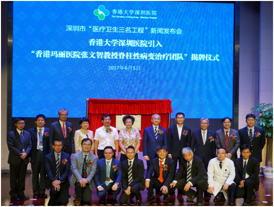 图1:2017年6月5日,深圳市“医疗卫生三名工程”项目——“香港玛丽医院张文智教授脊柱性病变治疗团队”揭牌仪式。