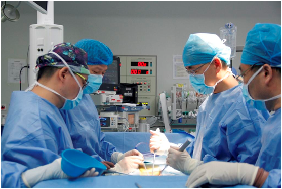 图2:“三名工程”张文智教授团队与依托科室同台手术,共同为一位腰椎管狭窄病人开展手术治疗。(从左至右依次为:朱锋顾问医生、黄德民顾问医生、张文智教授、吴建斌顾问医生)