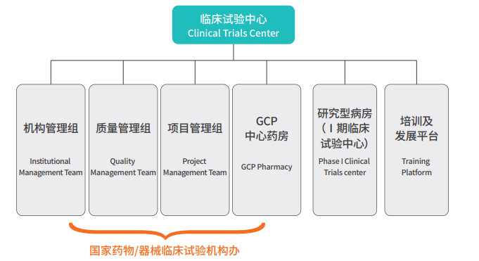 The center consists of the Institutional Management Group, Quality Management Group, Project Management Group, GCP Central Pharmacy, Phase I Clinical Trial Center, and Training & Development Platform. The organizational structure is as follows: