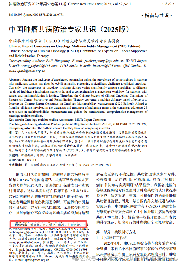 人口老龄化下,肿瘤患者共病患病率每年递增 0.54%,给恶性肿瘤的诊疗添了不少难题。中国临床肿瘤学会组织专家,针对29个核心问题,制定了《中国肿瘤共病防治专家共识(2025版)》,给一线医生提供规范的诊疗方案。