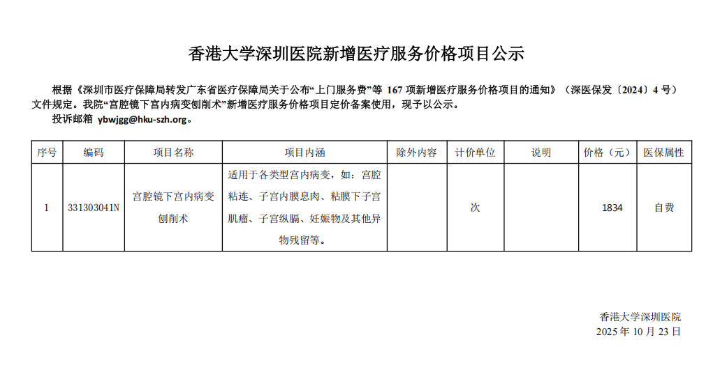 香港大学深圳医院新增医疗服务价格项目公示(20251023)
