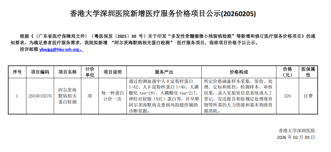 香港大学深圳医院新增医疗服务价格项目公示(20260205)