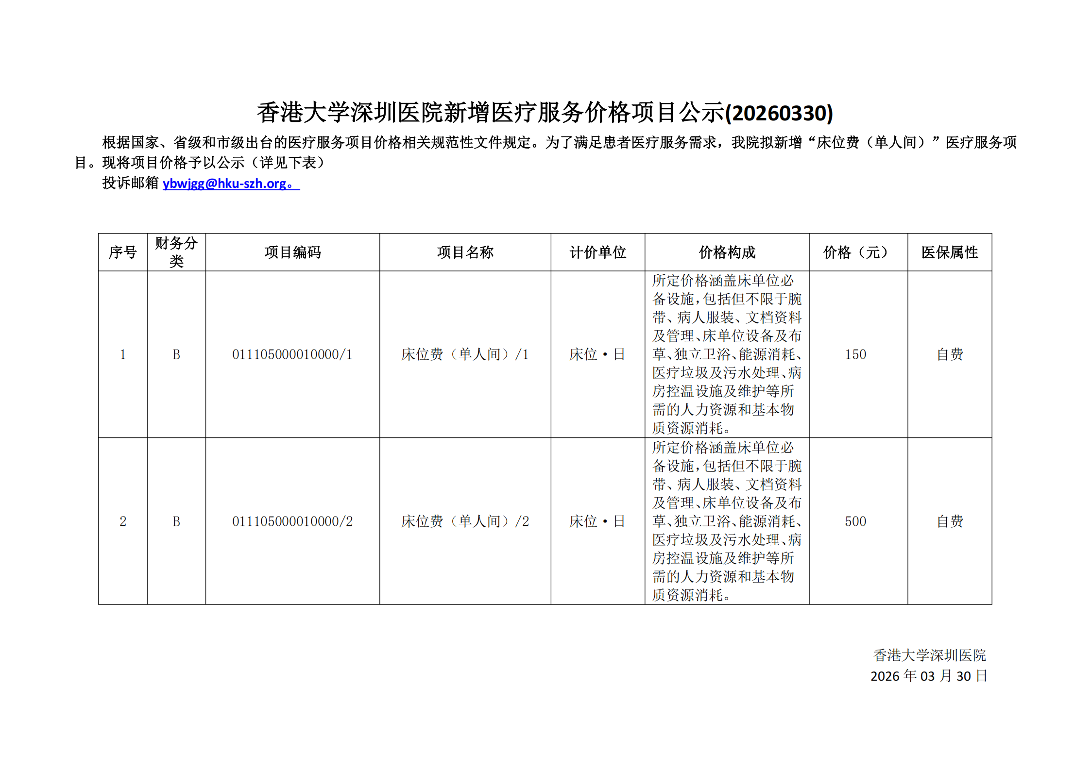 香港大学深圳医院新增医疗服务价格项目公示(20260330)